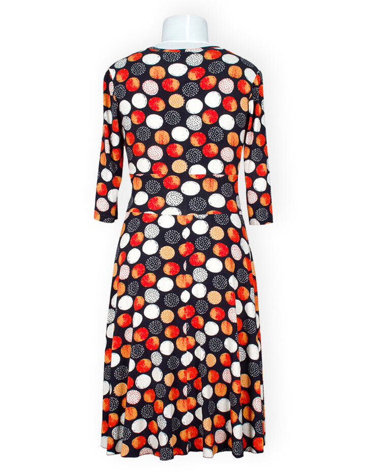 Mit diesem stilvollen Kleid im verspielten Punktedesign bringen Sie Farbe und Freude auf die Tanzfläche. Das dunkelblaue Kleid ist mit lebendigen Punkten in warmen Orangetönen und dezenten Weiß- und Schwarzakzenten versehen, die für einen frischen Look sorgen. Der elegante V-Ausschnitt sowie der Wickel-Effekt schmeicheln der Figur, während die 3/4-Ärmel für einen angenehmen Tragekomfort sorgen. Die knielange, schwingende Passform bietet Bewegungsfreiheit und macht dieses Kleid zu einem perfekten Begleiter für verschiedenste Anlässe – sei es zur Milonga, beim Ausgehen oder im Alltag.