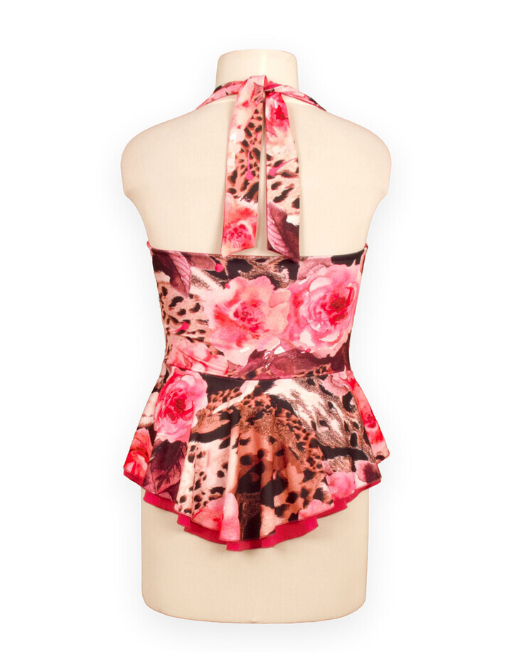 Dieses farbenfrohe Neckholder-Top vereint Eleganz und Lebendigkeit, ideal für Tänzerinnen und modebewusste Frauen. Der romantische Blumendruck sorgt für ein frisches und feminines Flair, während der Schößchenschnitt die Taille betont und eine schmeichelhafte Silhouette schafft. Der Neckholder-Verschluss bietet sicheren Halt und lässt den Rücken verführerisch zur Geltung kommen – ein ideales Outfit für Tangoabende und sommerliche Feste.