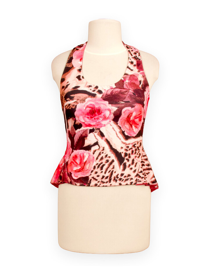 Dieses farbenfrohe Neckholder-Top vereint Eleganz und Lebendigkeit, ideal für Tänzerinnen und modebewusste Frauen. Der romantische Blumendruck sorgt für ein frisches und feminines Flair, während der Schößchenschnitt die Taille betont und eine schmeichelhafte Silhouette schafft. Der Neckholder-Verschluss bietet sicheren Halt und lässt den Rücken verführerisch zur Geltung kommen – ein ideales Outfit für Tangoabende und sommerliche Feste.