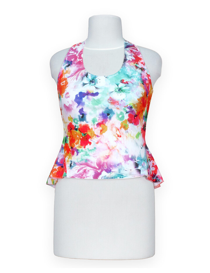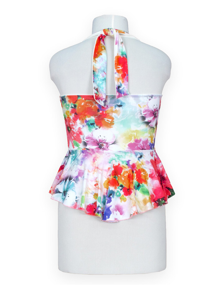 Dieses farbenfrohe Neckholder-Top vereint Eleganz und Lebendigkeit, ideal für Tänzerinnen und modebewusste Frauen. Der romantische Blumendruck sorgt für ein frisches und feminines Flair, während der Schößchenschnitt die Taille betont und eine schmeichelhafte Silhouette schafft. Der Neckholder-Verschluss bietet sicheren Halt und lässt den Rücken verführerisch zur Geltung kommen – ein ideales Outfit für Tangoabende und sommerliche Feste.