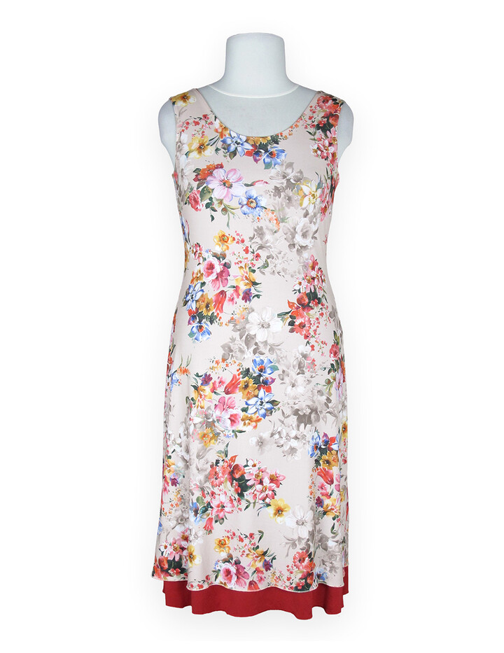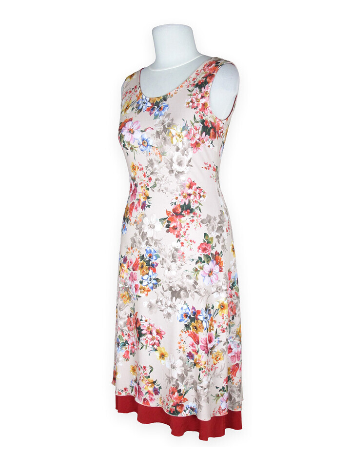 Elegantes Tangokleid mit romantischem Blumenmuster auf hellem Grund. Der figurbetonte Schnitt mit Rundhalsausschnitt vorne und tiefem V-Ausschnitt am Rücken betont die feminine Silhouette. Ein fließender roter Stoffeinsatz im Rückenteil sorgt für besondere Dynamik und schwingt bei jeder Bewegung wunderschön mit. Der rote Saum setzt einen stilvollen Kontrast zum floralen Design.